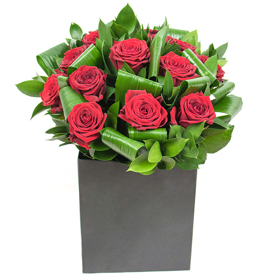 Illuminate your space with our radiant red rose bouquet, a perfect combination of stunning roses, aspidistra leaves, and ruscus.